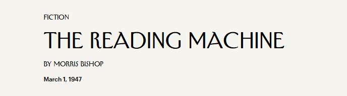 Think of the efficiency of the thing!” Professor Entwhistle was really warming up. “Think of the time saved! You assign a student a bibliography of fifty books. He runs them through the machine comfortably in a weekend. And on Monday morning he turns in a certificate from the machine. Everything has been conscientiously read!”